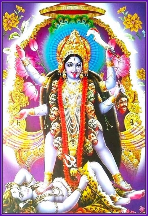神話によると、女神ドゥルガーがアスラの軍と戦ったとき、怒りによって黒く染まったドゥルガー神の額から新たな戦いの神、カーリーを生み出し、アスラを殺戮したとされます。