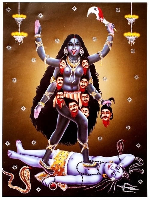 勝利に酔ったカーリーが踊り始めると、そのあまりの激しさに大地が粉々に砕けそうになった為、シヴァ神はカーリー神の足元に横たわり、踏みつけられる事でその衝撃を弱める必要があり、シヴァ神の腹の上で踊る姿で描かれるのはこれに由来しているそうです。