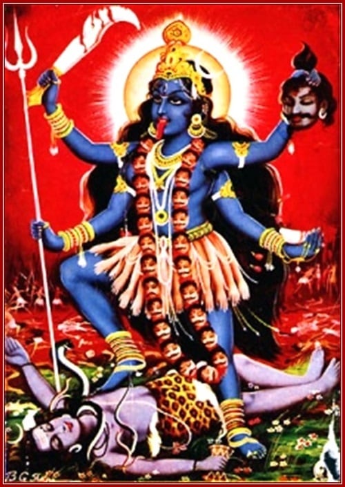 神話によると、女神ドゥルガーがアスラの軍と戦ったとき、怒りによって黒く染まったドゥルガー神の額から新たな戦いの神、カーリーを生み出し、アスラを殺戮したとされます。