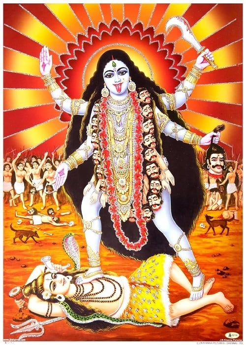 神話によると、女神ドゥルガーがアスラの軍と戦ったとき、怒りによって黒く染まったドゥルガー神の額から新たな戦いの神、カーリーを生み出し、アスラを殺戮したとされます。